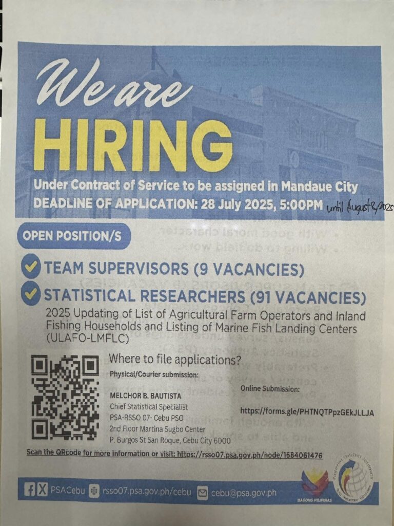 ATTENTION CUBACUBNONS Naghiring ang Philippine Statistics Authority og Team Supervisors ug Statistical Researchers. Palihug og tan-aw sa dugang detalye. Daghang Salamat!